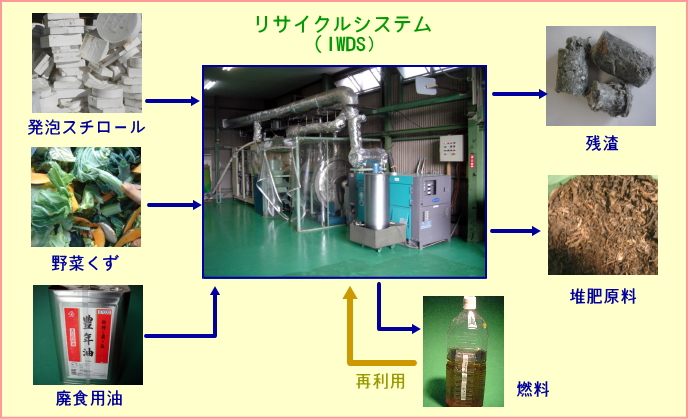 IWDSは、サンライフ株式会社が開発したリサイクルシステムです。発泡スチロール・野菜くず・廃食用油を投入することで、